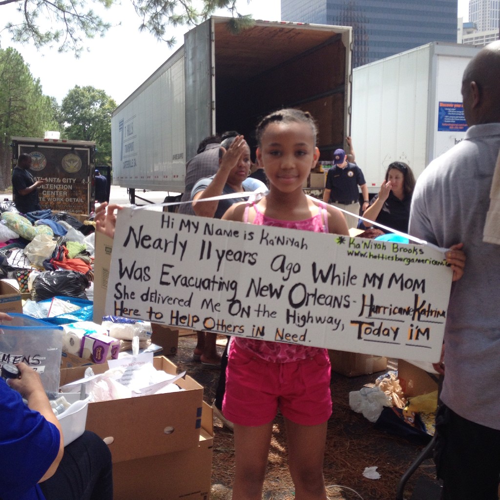 For our 6th featured street portrait during 12 Days of Nice Strangers, I give you Ka’Nitah. I’ll let her tell you her story through her sign. I met her while traveling at the speed of bike past the old Atlanta Civic Center, where this drive for disaster relief supplies was underway. She was with her aunt, but I actually tracked down her mom the following week and interviewed her on the phone. That’s a whole other story.