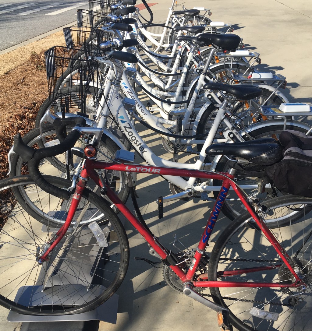 In the meantime, there’s a park named Rock Mill (pictured) in the nearby city of Alpharetta, Georgia that already has Zagster bikeshare. It already has access to a multiuse path called the Big Creek Greenway where I ride frequently (that’s where I went when I took my bike, pictured, out of the attic after 20 years — that story kicks off Chapter 2 in my book). It already has little brochures saying all the good things about bike riding and including detailed maps (from a bike advocacy group headed by the man who was my presentation partner during our League Cycling Instructor training). The city already has a plan for an access-for-all loop that connects the greenway with the city’s downtown and its other commercial districts that a bike rider will be able to use to actually go places. And my mother lives there, so I have yet another reason to be there. So I’m open to that one.
