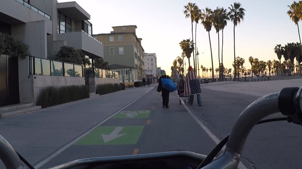 I’m just back from visiting my older daughter in the City of Angels, and I have a lot to process internally before it comes out in words. In the meantime, here’s a view from my bikeshare bike on the path by the beach in Venice.