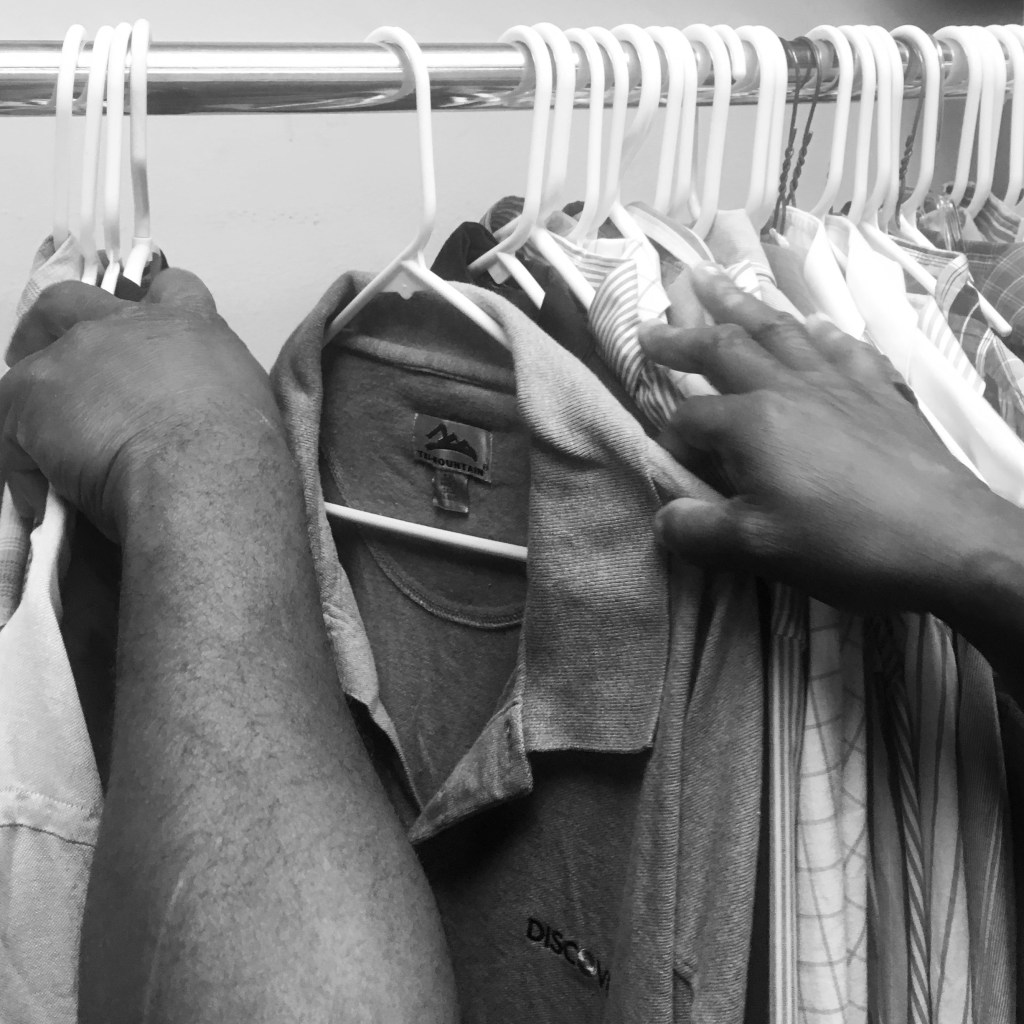 “Does anyone want to be a hand model for a couple of minutes?” I finally asked. One man immediately put up his hands, and we moved seamlessly to the rack, where he started slowly flipping through the shirts to my right as I took photos.