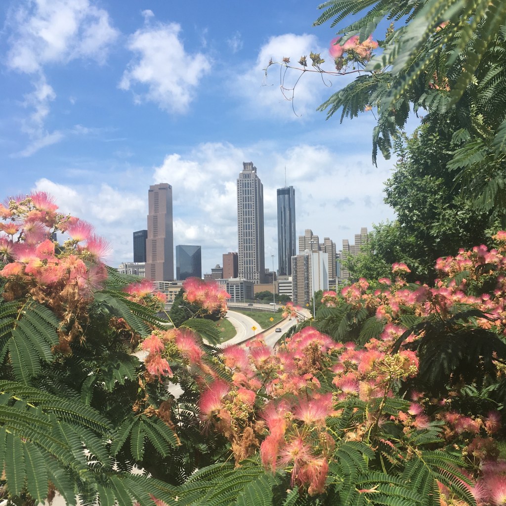 So much has happened since last I wrote here. I don’t know where to start, so I won’t. I’ll just share this lovely view of Downtown Atlanta that I passed while Traveling at the Speed of Bike today. I am continually amazed at how much beauty there is in our world, and I particularly love mimosa trees (there was one in our side yard in Mineola, New York when I was growing up). That’s all. Hope you are well.