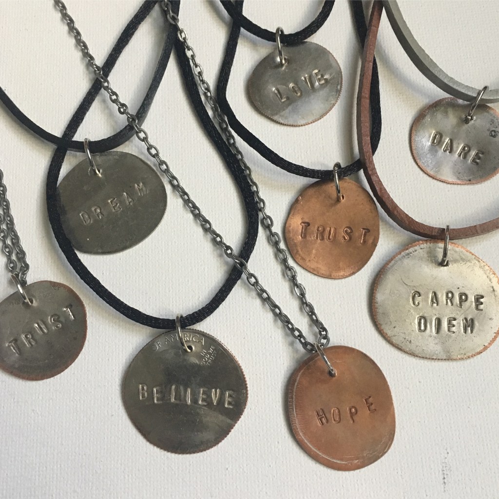 I made these necklaces from the coins I smashed on the tracks as research for my new short story, Pennies on the Tracks (which I already submitted — fingers crossed).
