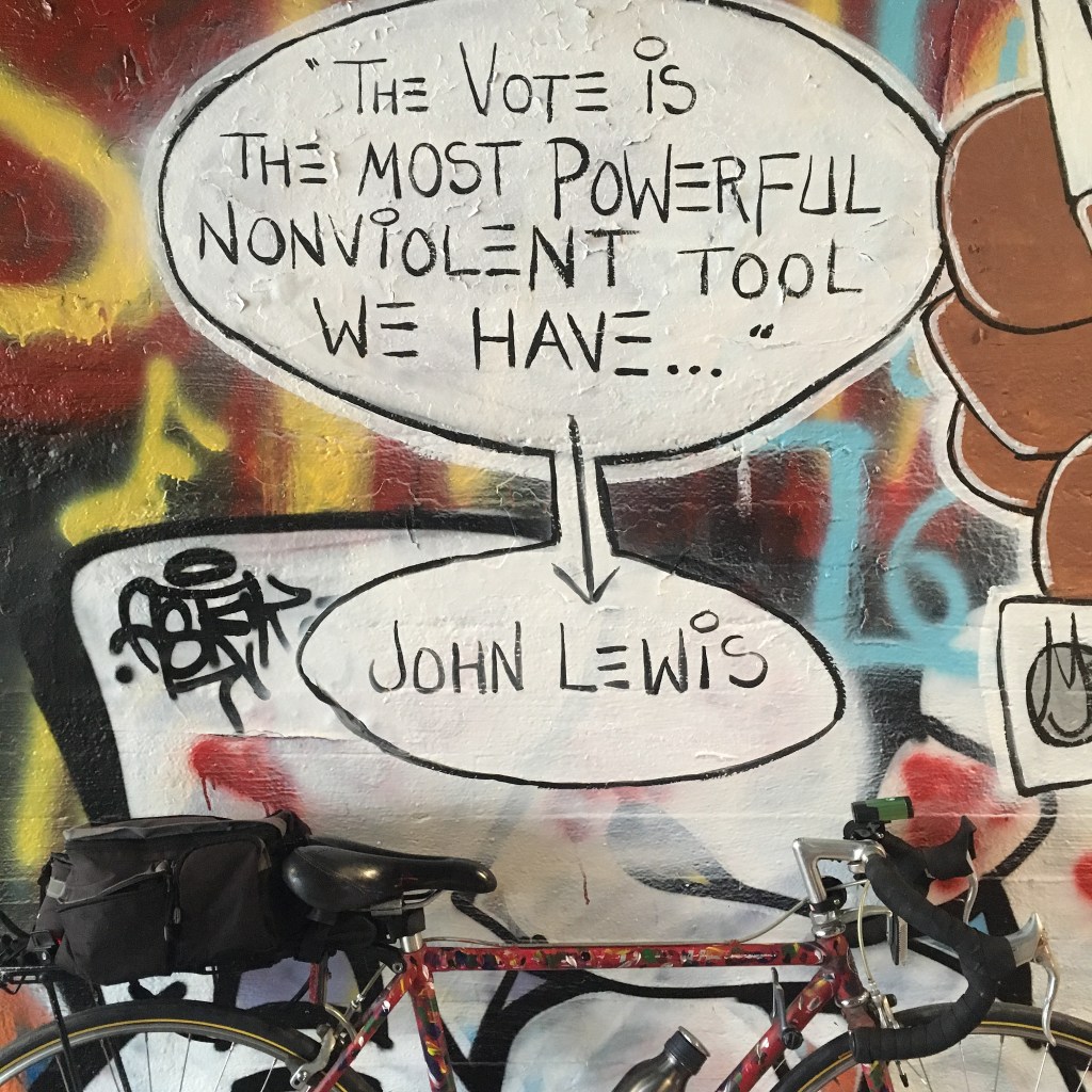 While Traveling at the Speed of Bike yesterday, I passed this artwork and I got to thinking, yet again, how each day we have many votes. We vote with our forks for the food system we want. We vote with our dollars for businesses we want to support. We vote with our pedals for the transportation options we want. And today in the USA, we vote with our ballots for our representatives in our democracy.