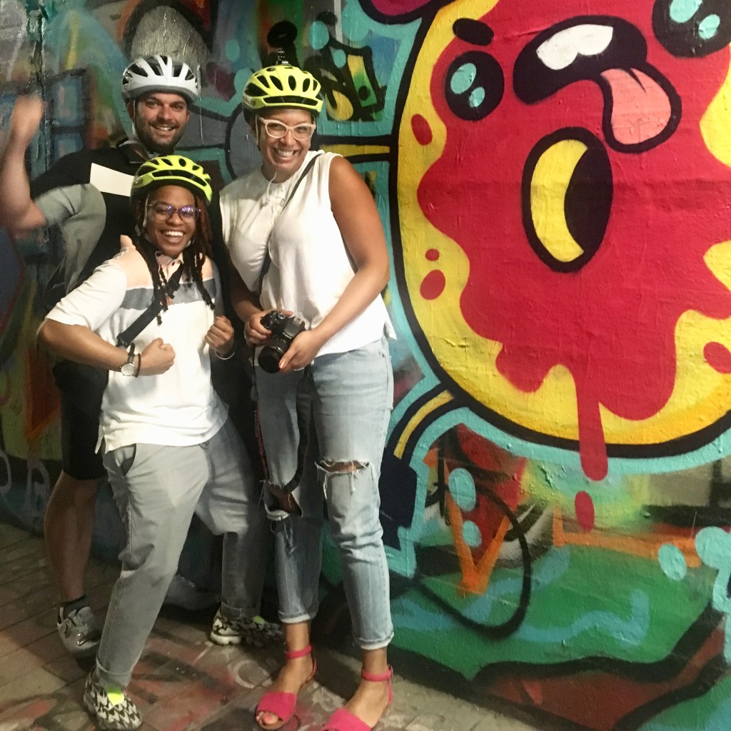 For this photo, I had pre-rode the Krog Street Tunnel and knew that there was a pirate cowboy doughnut mural just beyond where we usually went. Since we had just patronized our favorite local doughnut shop, Revolution, it seemed a logical choice for a photo and to stress support of local businesses (which, by the way, studies show bike riders do more, and more often, than those in cars). (And besides, who doesn’t want to see a pirate cowboy doughnut?)