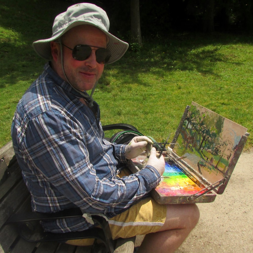 Meet Peter. He is TodaysNiceStranger. I was Traveling at the Speed of Bike on the Sustainability in Action Bike Tour* route and had just come from the demonstration fruit orchard at Piedmont Park when there he was, just sitting on a bench painting away. I asked if I could take a photo and we got to talking. I learned that he was in Atlanta from London to attend his daughter’s graduation from Emory University. She is then on her way to Côte d’Ivoire to set up a development project. He is quite fair and was getting quite sunburned so I am hoping he is not in pain today while being a proud dad in the audience!