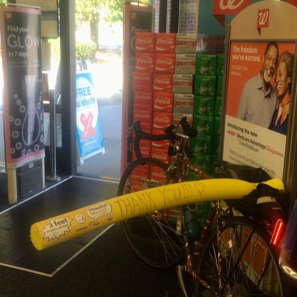 I’m now proud to announce National BikeNoodle Day on October 30th, strategically chosen to encourage more caution from motor vehicle drivers, especially considering that children will be out and about the very next night for Halloween. BikeNoodle also educates drivers as to what three feet (the legal passing distance in most states) actually looks like. (I am always pleasantly surprised that drivers actually thank me at red lights for using BikeNoodle because it helps them judge distance better.) It’s also the second-to-last day of Biketober and two days before the three-year anniversary of when I started using BikeNoodle (that story is in my book).
