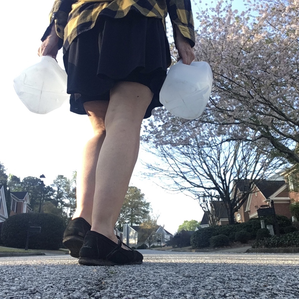 In case you saw me (in person or on Instagram) and were wondering what the hell I was doing with the big jugs — it’s been 3 months today of carrying water a mile up and down a huge hill each morning* (at first a total of 16 pounds; then a total of 42 pounds).