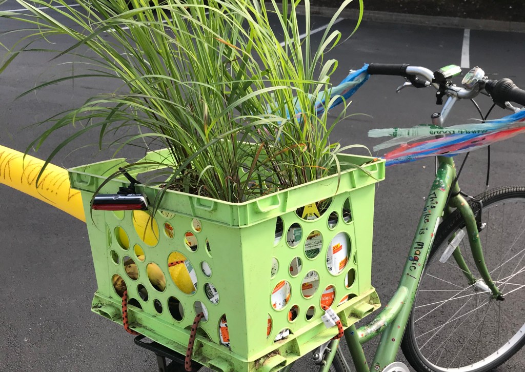 So I’m Traveling at the Speed of Bike home from a doctor’s office and Home Depot yesterday, la la la, with my handlebar tassels and lemongrass plants blowing in the wind, and I’m wondering the obvious again: “What’s next? How can I use this time to share my skills, learn new things that could be helpful in a world-in-crisis now and in the future, and help others?”