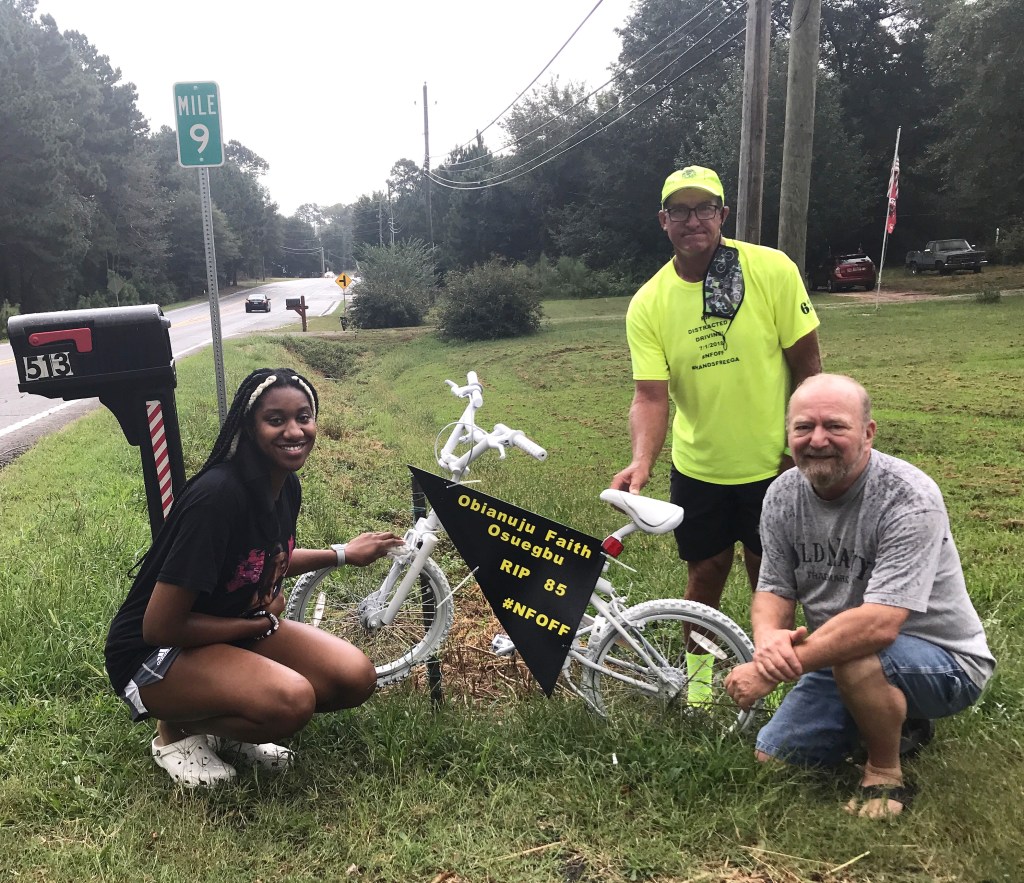 I was there to bear witness this past Saturday at the dedication of the newest ghost bike in the USA, for a 17-year-old girl who was killed while riding her bike home from the supermarket where she worked in Winder, Georgia. Pictured are her sister Toya; Dave Mathews, the man who runs the nonprofit Bike Friendly Atlanta that dedicates these ghost bikes in the southeastern USA (this is his 85th); and Rick, the man who gave permission for the ghost bike to be on his property (in front of which you can still see the police markings).