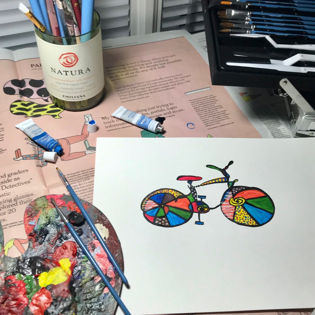 I sing out loud. I bite each word. I do not allow distractions as I pick up my brushes and paint the vision I’ve been carrying around in my head for years now. It’s a simple, playful little thing — at a time when I think, perhaps, simple playful little things matter more than ever.