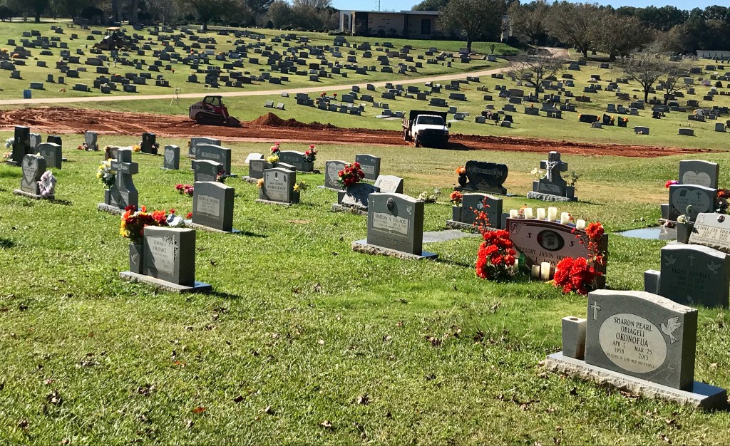 A man operating a backhoe is digging another grave. Another man in a dump truck gathers up the red clay and drives it to a spot in the middle of the cemetery to dump and spread it. An enormous swath of red clay spreads like a virus with each load. I watch, and watch, and watch. A small service is ending not far from this, and a soon-to-start service is all set up, the nine seats neatly spaced. There is so much death right now.