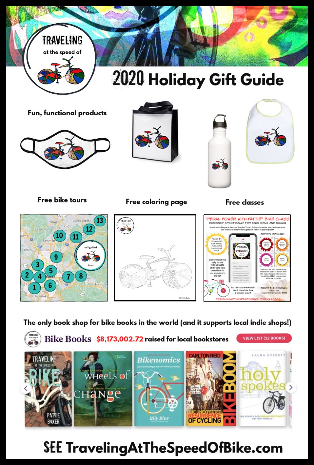 If you come up with a cute way of packaging or presenting your gift, post a photo or video and tag it #TravelingAtTheSpeedOfBike on social media to help inspire others! If you want to bounce around ideas for how to create a bike-themed gift package for someone on your list, feel free to contact me. Sounds like fun, and we could use some of that right about now.