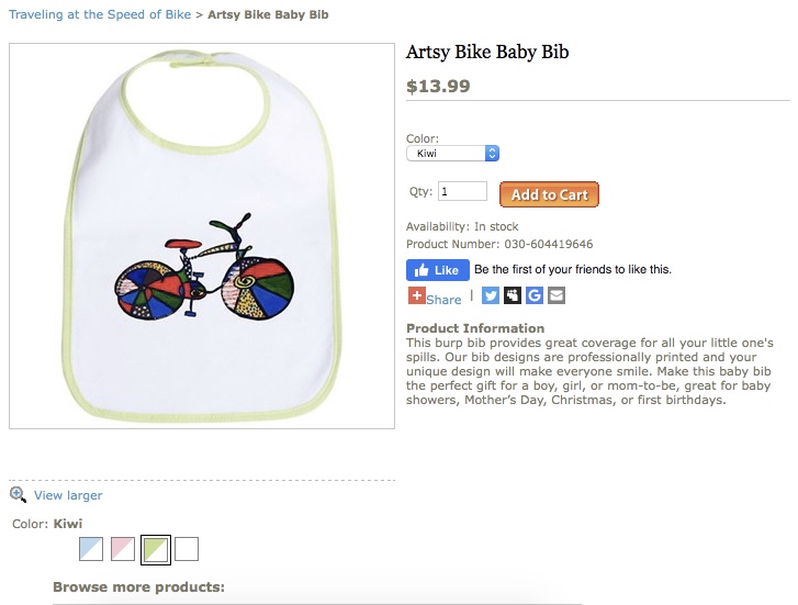 This is my friend’s grandbaby modeling the Artsy Bike baby bib! You know you want this for your baby, grandbaby, or bikey friend’s baby! It’s just $13.99 and it even comes in other trim colors — blue, pink, and green. What’s more, all proceeds help more women and girls ride bikes (like this girl, before you know it, although her expert cyclist granddad surely has that covered). Click here to order.
