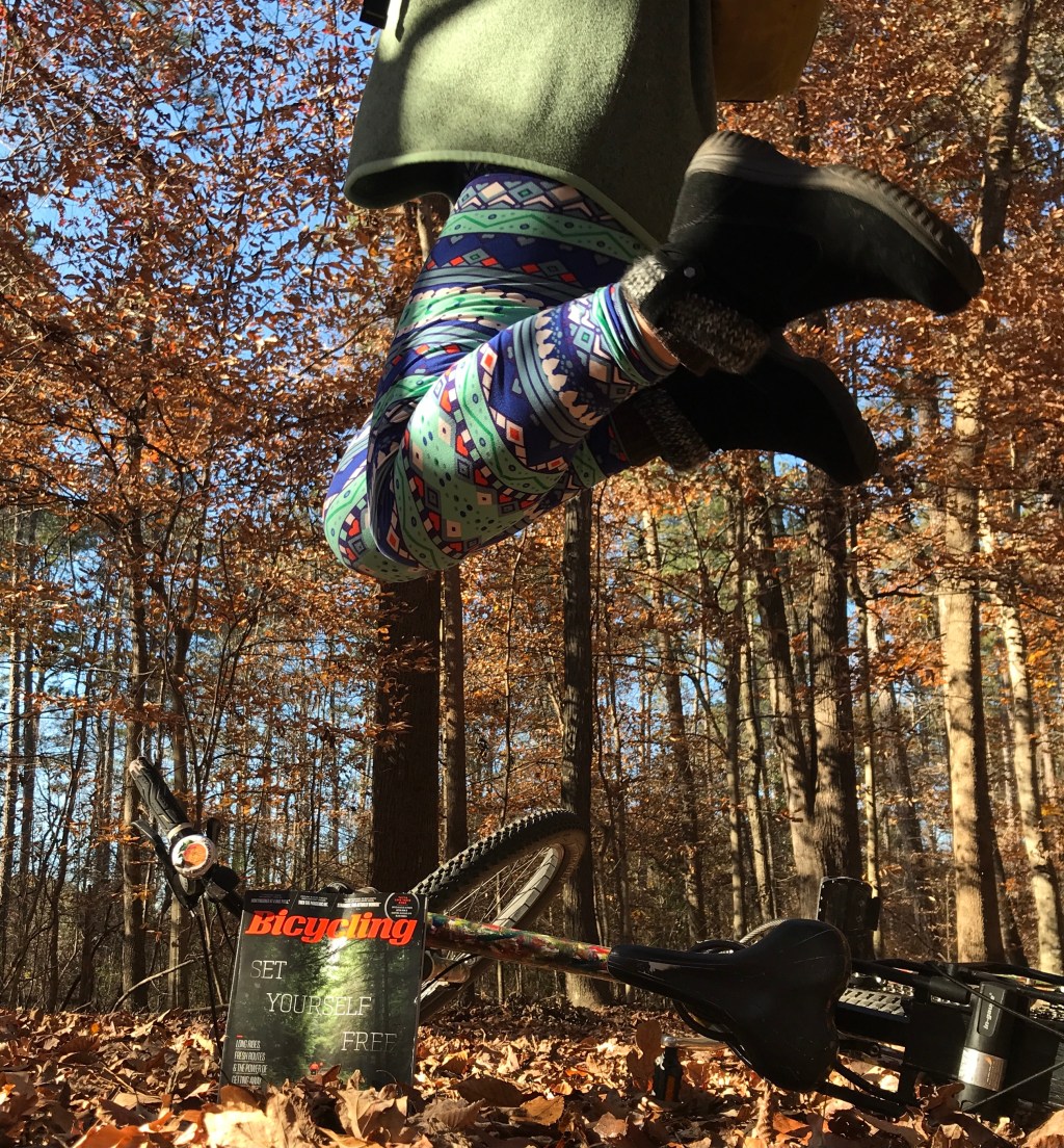 Still leaping my brains out, folks, trying to rise above the constant barrage of bad news. The current issue of Bicycling magazine, with its stunningly beautiful forest photo, reminds me to continue to set myself free. I even leaped in front of the Wishing Tree again, for extra good luck. The whole process of taking these crazy photos make me laugh out loud, and sometimes it’s my only big, hearty laugh of the day.