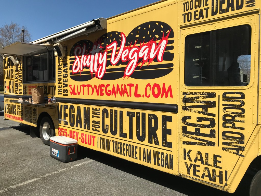 So I was driving home from riding my bike (yet again) at Slow Duck Crossing (it’s fiction; it’s real). At a red light, I saw across the road, in the parking lot, the tell-tale yellow truck of Slutty Vegan!