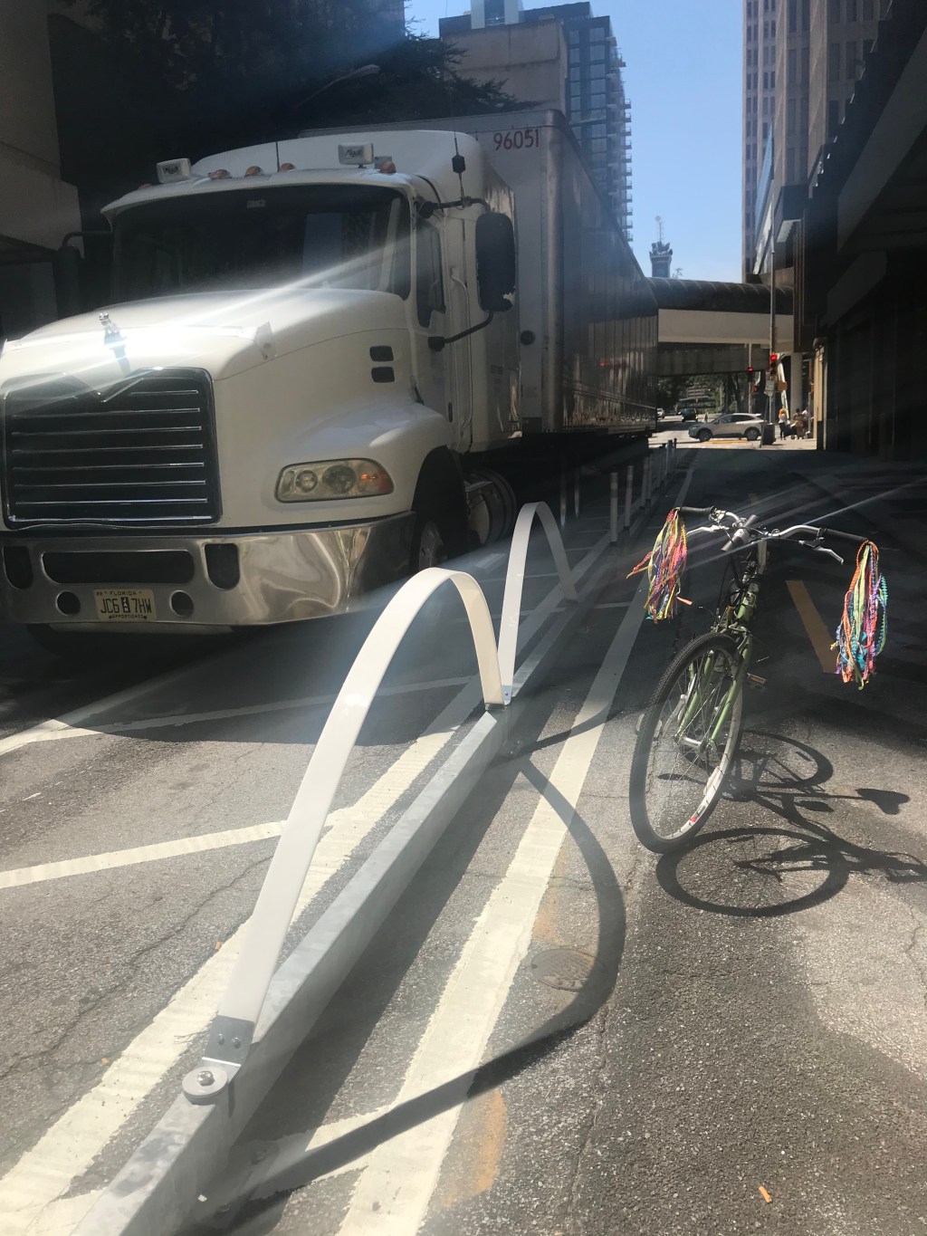 I also understand from an article online that you have a loaner library of wave delineators. How would I go about accessing that? Many of the suburb-cities (even those with Bicycle Friendly Community certification) have numerous bike lanes that don’t meet NACTO guidelines, and although I know these delineators are not made to stop motor vehicle drivers, they do serve as a visual divider (as you can see with the truck and my bike in the Downtown Atlanta location shown in the photo and video above). I believe that if one suburb-city here showcases one (or more), there could be greater interest throughout the region.