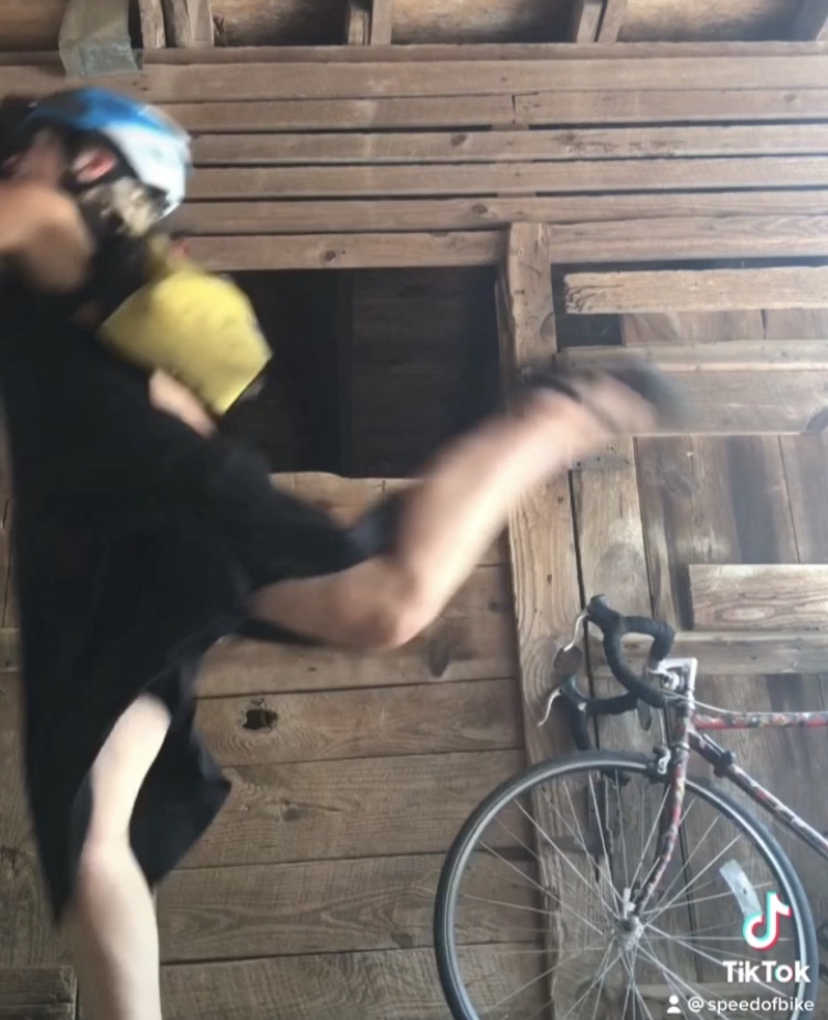 Having completely perfected my daily Leap of Faith* (as I look forward to the day when riding a bike does not require one), it’s time to pump it up. I’m working on some new choreography, lol! Here’s a start!
