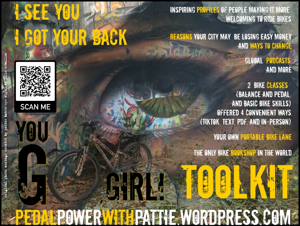 I am reserving my next free Pedal Power with Pattie class for up to three teen girls or women who have experienced road violence (including harassment) and are thus hesitant to ride again. Please contact me here to schedule. I am also available for phone consultation (and have talked several women back onto their bikes). You may also find my other TikTok account, which is a series of bike skills tips and inspiration, helpful. I have additionally created these welcoming routes with you in mind.