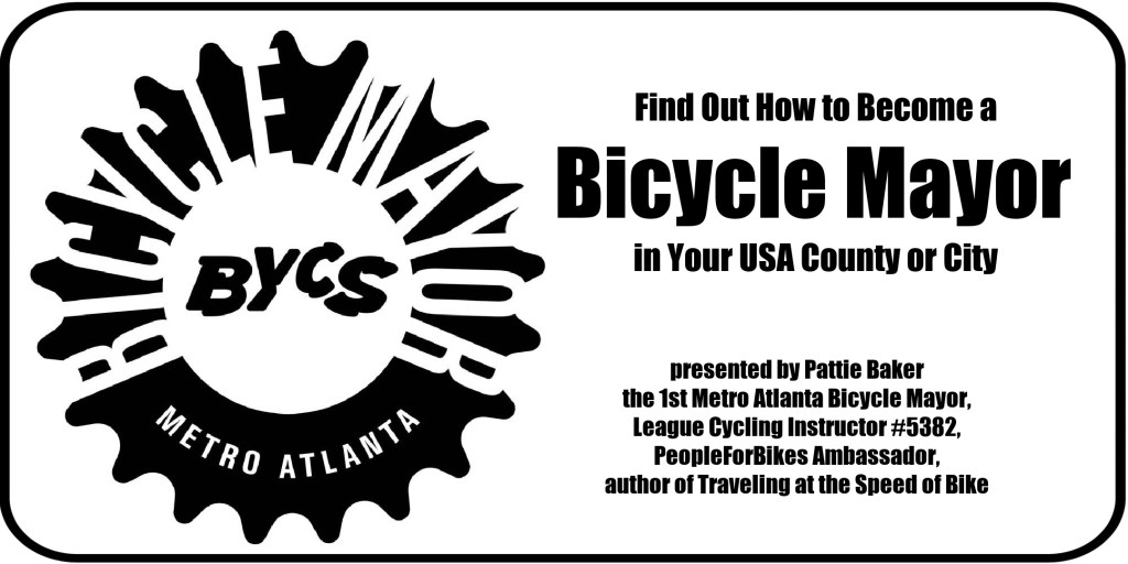 I’m the first Metro Atlanta Bicycle Mayor* (representing 10 counties and 70 cities with the intention to replace myself with truly local people in as many of those places as possible), and one of only six serving in this capacity in the USA. I’m in my tenth month of pro bono service in a two-year term — here is my 6-month executive summary, if interested; here is a sneak peek with what’s upcoming to round out my first year). Join me! (Fun fact: I decided to apply, with 12 endorsements from leaders throughout Metro Atlanta, after surviving a hit-and-run in the place I call home. If it is helpful to you, here are 11 tips following an assault while riding a bike.)