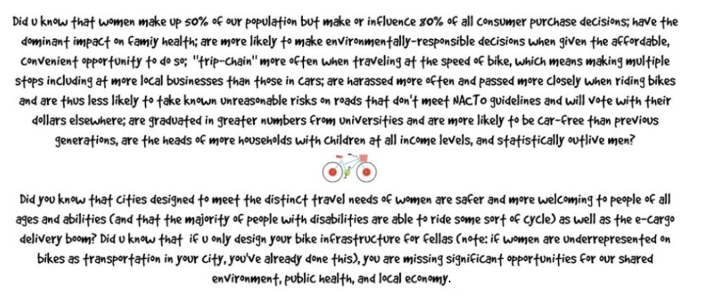 Oh, and women “trip-chain” more than men, which means we make multiple stops, which means safe bike parking** and connected bike networks matter and the lack of them is a disincentive to replacing the local car trip (something like 70% of which are under three miles) with a bike. (And have we mentioned hilly and hot yet? Still-unaffordable-for-many ebikes of all varieties — which flatten hills; reduce the impact of heat; enable access for those with disabilities and varying levels of fitness; and provide achievable ways to carry heavy loads including children — need to be more supported via incentives, financing, and equitable bikeshare systems.)