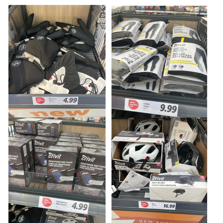 There are affordable-for-many bikey things for sale right now at Lidl’s! If a too-hard seat on your upright bike has been your barrier to riding (or your seat is old and ugly), you’re in luck for just $4.99! I bought the memory-foamed seat cover for Magic (whose seat is ripped).