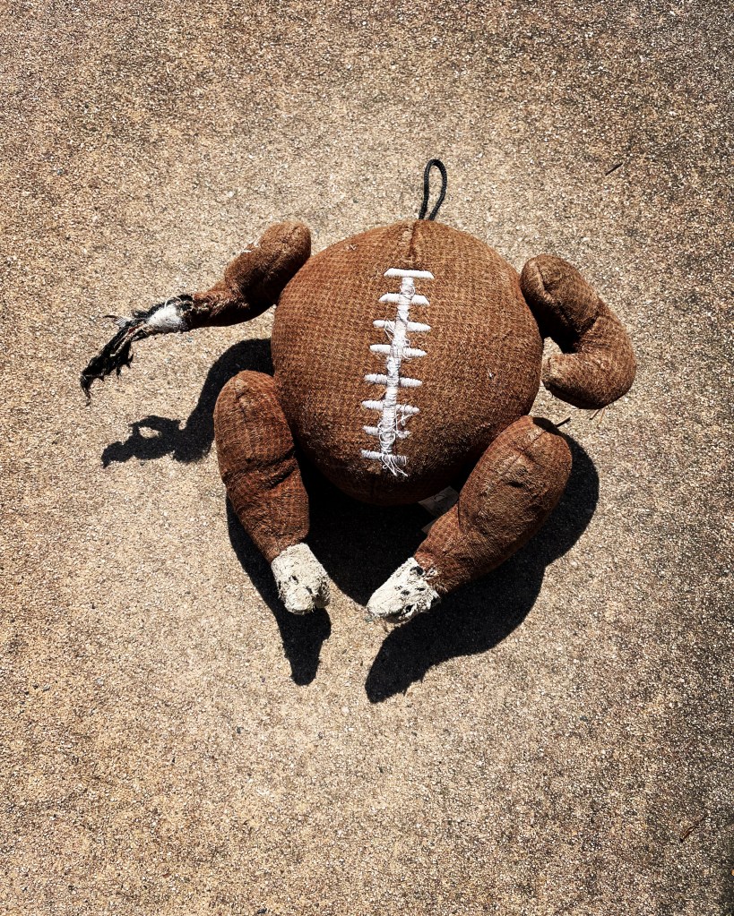 I even found a stuffed football turkey along the way (see photo below), just fending for itself out there in the big world. Maybe I should buy it some Survival Couture . . .