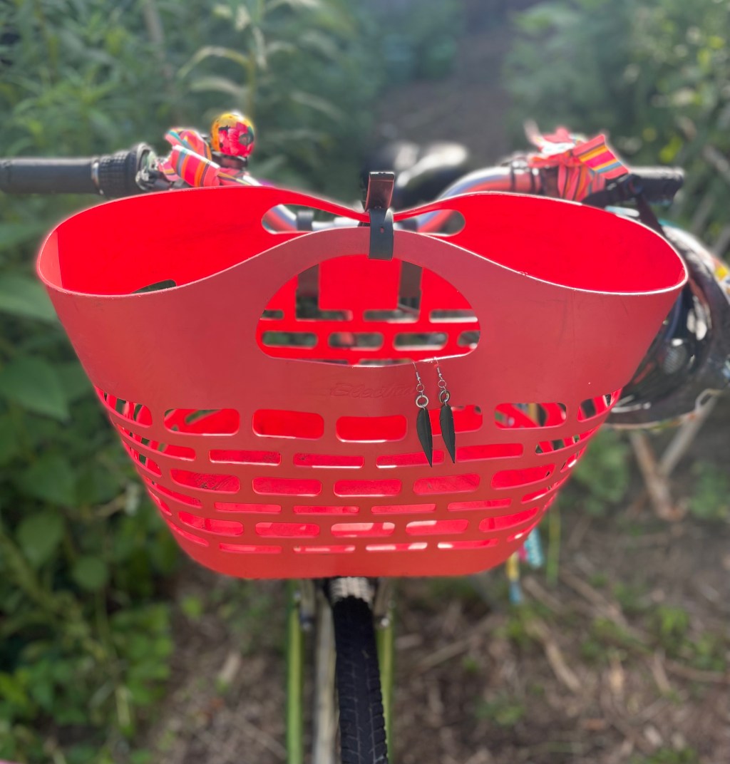 I love being a woman on a bike with a basket! I especially love that my basket (which I move easily from bike to bike) is a pound of upcycled ocean plastic (known as a Plasket and shown here rockin my BikeBloom upcycled bike tube earrings). See the feature story I did on it! I use it every single day. It carries my groceries, rollerskates, locks, snacks, hammock, picnic blanket, packages to ship, gifts to deliver, public fruit harvests, and more. (I’m a joy-based lifestyle influencer and professional communicator who has successfully normalized riding a bike as transportation in our cities for years now.)