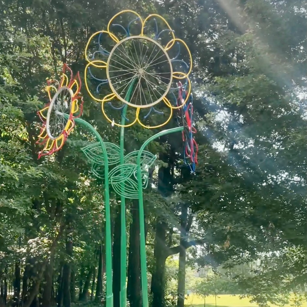 Meet at the gorgeous new bike rack (by local artist Huelani Mei) midway down the main road after you enter Brook Run Park from North Peachtree Road in Dunwoody, Georgia, USA (see photo below). Bring a bike or adaptive cycle that fits you with working brakes and at least three gears — or an e-bike/cycle! Bring a water bottle. There are multiple water fountains and bathrooms along the route. Feel free to “tap out” at any time if you’ve had enough. (This ride is free and you assume all risks by participating. No tickets required.)
