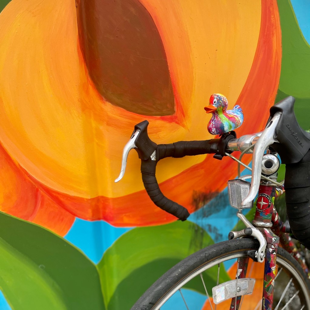 It felt so nice to ride my bike-of-choice (my road bike) in my way-of-choice (on streets and in protected infrastructure) yesterday — past murals (including this peachy one), to a community garden, through a school reunion in a park, across a college campus, down a brick-lined alley to a cute pop-up coffee shop and ultimately under an stunning, old, unpruned magnolia tree to rest.