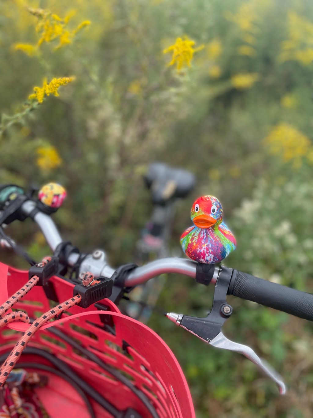 Named Disco, he was brought back for me from Amsterdam by my friend Caryn. I gorilla-glued him onto a bike light strap and he’s been just the most fun little companion ever since, easily switching from bike to bike (I’m up to six now). Especially in my suburb-city, I can go 15 miles without seeing another human being outside a motor vehicle. Disco helps lighten my spirits about that. I also like to take a ridiculous number of photos of him and make TikToks with him. C’mon, you gotta admit. He’s fun: