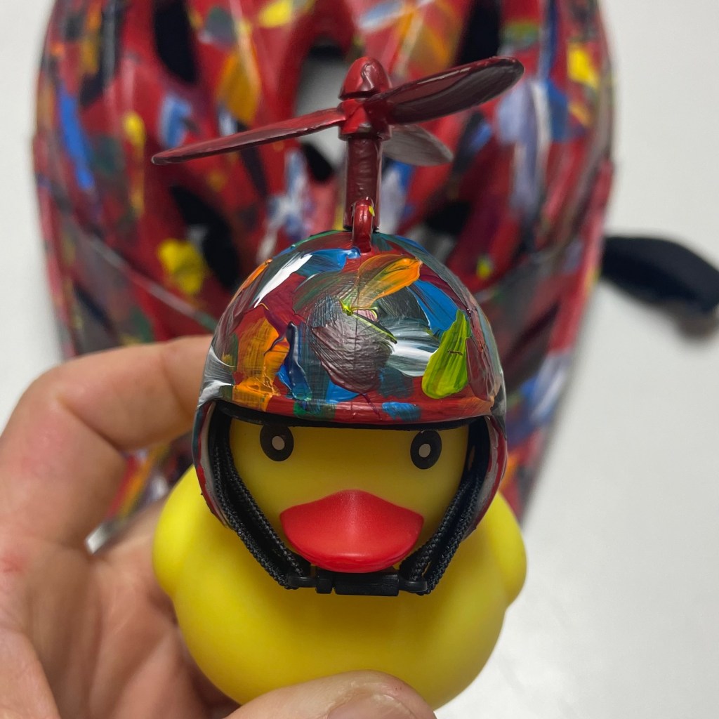 Hubby got me a new duck to travel on my handlebars with Disco Round America with a Duck. (Fun fact: this one lights up! Follow for the fun in 2023!) I had to paint his little helmet (of course). I haven’t named him yet. I’m having a TikTok contest :). Join in!