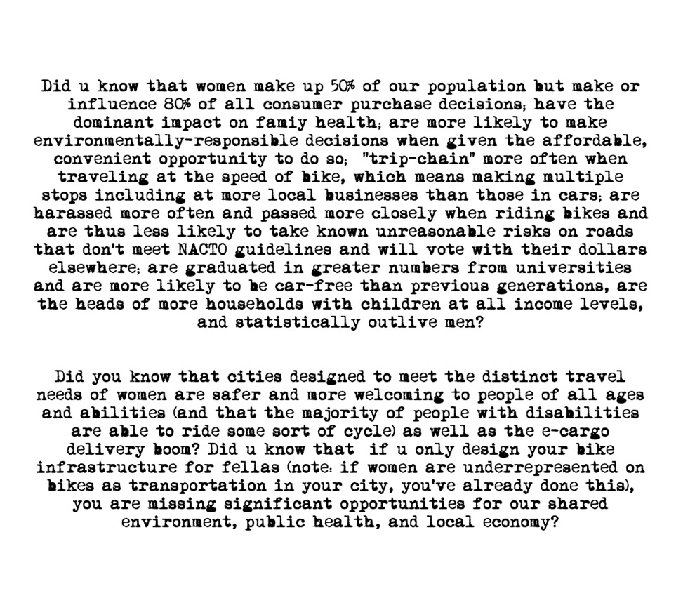 So, sure, keep discounting my economic impact as a bike rider at your own risk. Keep discounting women (but read this first, please, and watch the following TikTok — if you are a business owner, I’m doing you a favor. You’re welcome.)