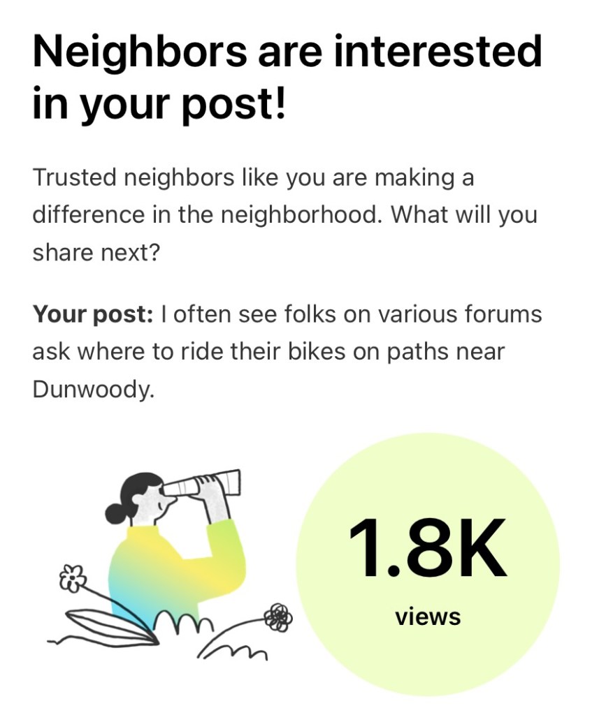 So I got a notice this morning that 1.8k people within the first 48 hours have viewed my recent post on the community forum NextDoor (which I’ve reprinted at the end of this post*), where I provided some trails suggestions in many of the Metro Atlanta cities that surround us in response to various people lately who have the simple dream of finding welcoming places to ride their bikes.