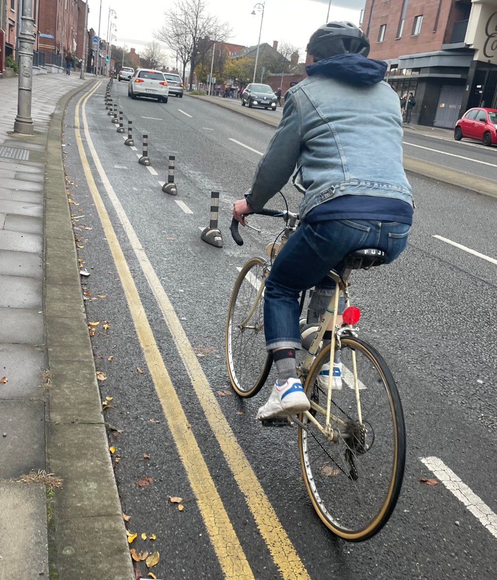 I have requested the bike-lane protectors in the photo above be added to every major road’s current bike lane (which do not meet safe-acccess-for-all standards), at least as a small segment to each as a pilot test, within a month. I just rode them all around Dublin, and they work (at least until more permanent infrastructure can be installed).