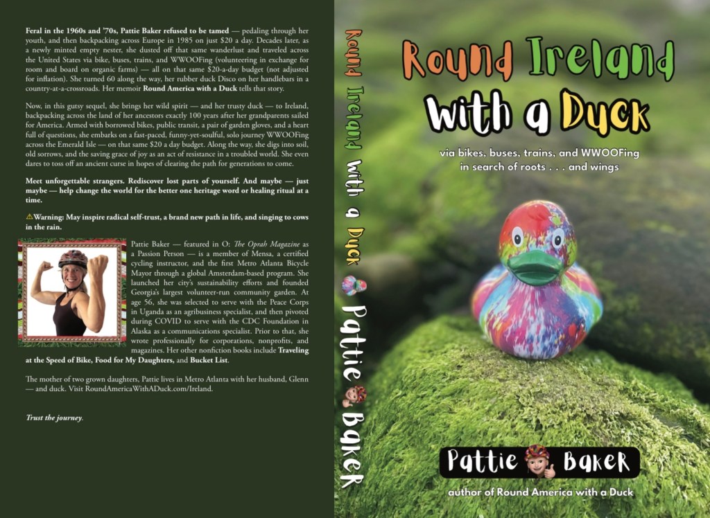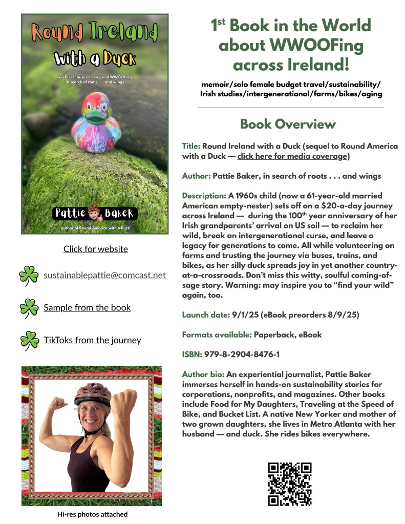If you buy Round Ireland with a Duck and love it, please consider leaving a positive review on both Goodreads and Amazon (you can check the box on Goodreads now that says you want to read the book). Then, share with folks you know on social media and in person who may be interested in: travel memoirs, unique adventures, active aging, Ireland, farms, bikes, and the search for hope — and home — in not just one but two countries-at-crossroads. They don’t need to read Round America with a Duck first, but it would certainly enhance the experience. If you or friends/family members are in the media and you think this story may resonate, here are some details: