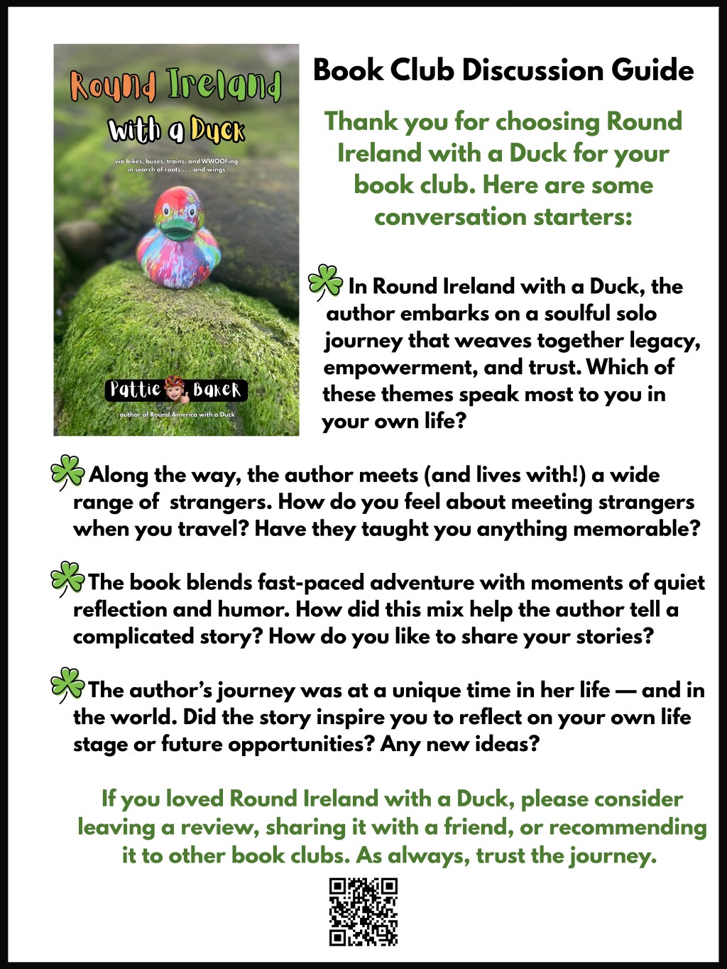 With everything going on in the world, doesn’t the thought of escaping to farms in Ireland sound just about perfect right now? You can, you know — at least virtually. Round Ireland with a Duck will take you there — sensually, lyrically, and provocatively. It will also raise questions that pertain to other parts of your life. Here are some, which you may want to explore with your book club. Please let me know if you’d like me to answer any other questions for you!