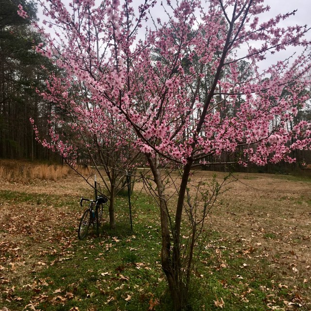 My friend Rod planted these peach trees as part of a cool experiment. They bore fruit for the first time last year, and are currently blooming.