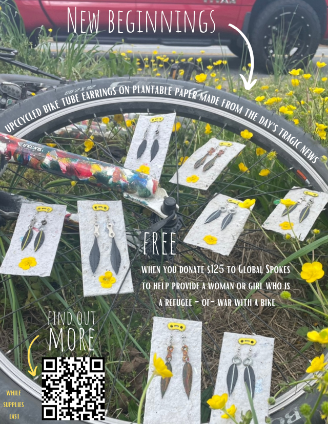 UPDATE: You can get a pair of these upcycled bike tube earrings on plantable card stock (while supplies last) when you donate $125US to Global Spokes, which repairs bikes for refugees-of-war. See here. So I […]
